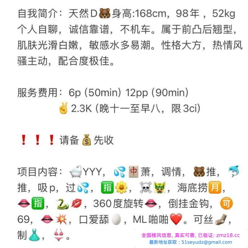 ⚠️ 本站为信息分享平台,并不对寻欢经历负责,请注意个人防范。凡是有要求路费/上门/红包/定金/保证金/照片验证/视频验证/提前付费等类似行为的都是骗子,同时也请注意任何形式的推荐办卡行为、引导下载APP行为,请勿上当受骗。碰到有问题的信息,请及时举报给我们删除信息。如果发布的信息涉及个人隐私,也请及时举报,我们会核实后第一时间处理。